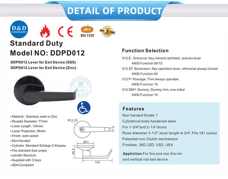 The DDPD012 Standard Stainless Steel Lever Trim by D&D HARDWARE is a premium lever trim engineered for seamless integration with exit devices in commercial buildings. Available in Stainless Steel (SSS) or Zinc, it features ADA compliance, non-handed operation, and multiple functional options (Entrance, Storeroom, Passage, Dummy). This lever trim integrates seamlessly with Panic Hardware, Door Locks, and Exit Devices, ensuring compliance with safety and accessibility standards in retail stores, office complexes, and public facilities.